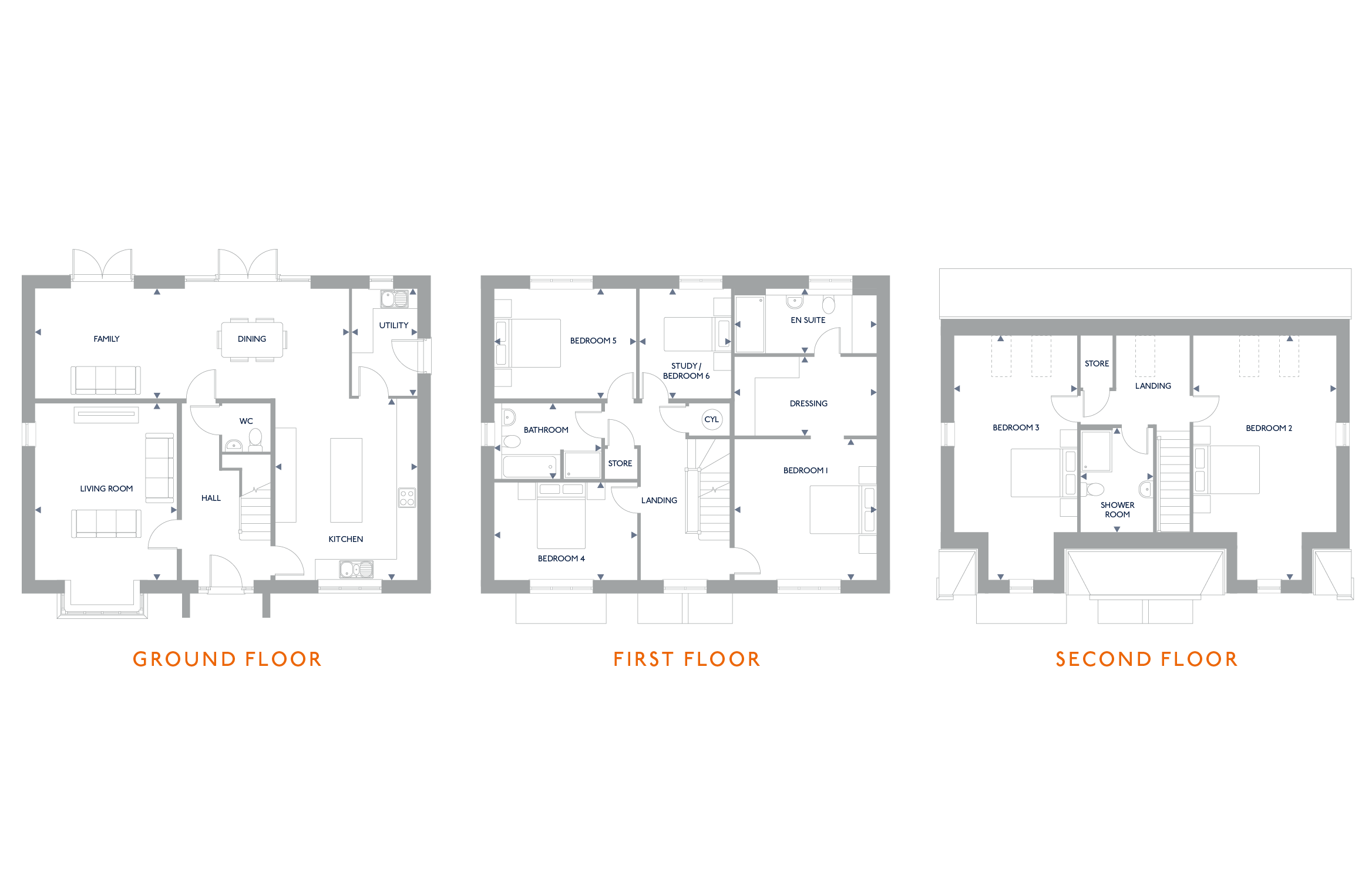 Kirkby is an impressive 5-bedroom detached home designed with modern living in mind. Set across three floors, this stylish property features a generous open plan kitchen, dining, and family area with French doors opening onto the rear garden. Additional highlights on the ground floor include a separate utility room and downstairs WC. Upstairs on the first floor, you will find three well proportioned bedrooms, including the luxurious primary bedroom with en-suite and dressing area, as well as a flexible sixth bedroom or study and a bathroom. The second floor provides two additional double bedrooms and a stylish shower room. This home comes complete with a double detached garage and electric vehicle charger.